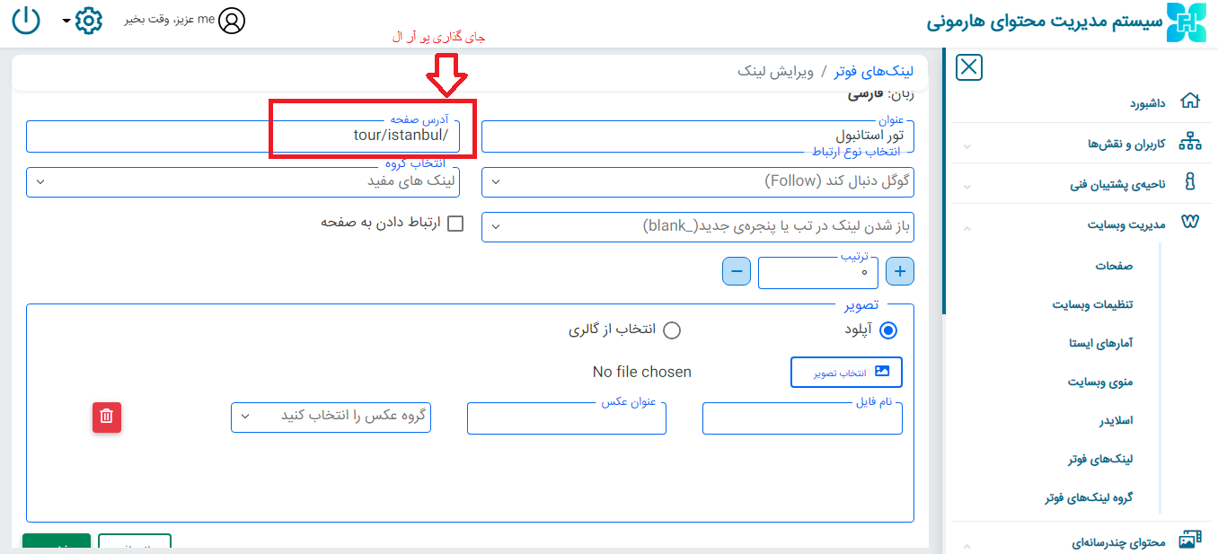 سپس از قسمت مدیریت وبسایت ← گروه لینک های فوتر ← درقسمت آدرس صفحه جای گذاری نمایید.