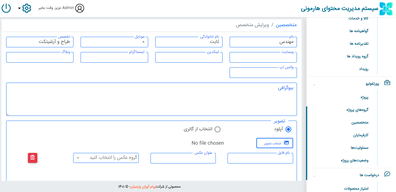 نام، نام خانوادگی، موبایل و تخصص را وارد کنید؛ در صورت تمایل سایر فیلد های موجود را با اطلاعات متخصص مورد نظر کامل کنید.
