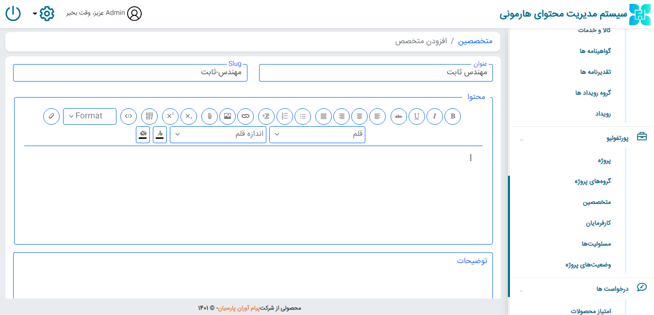 از قسمت پورتفولیو ← متخصصین ← افزودن متخصص جدید ← عنوان و محتوا را وارد کنید.