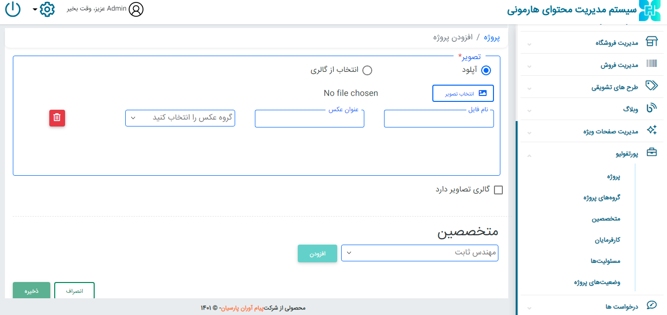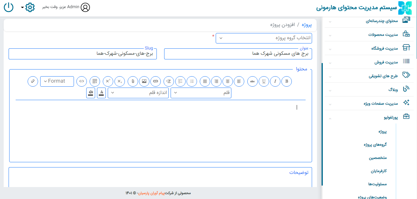 از قسمت پورتفولیو ← پروژه ها ← افزودن پروژه ی جدید ← گروه های پروژه را انتخاب کرده و عنوان و محتوا را وارد نمایید.