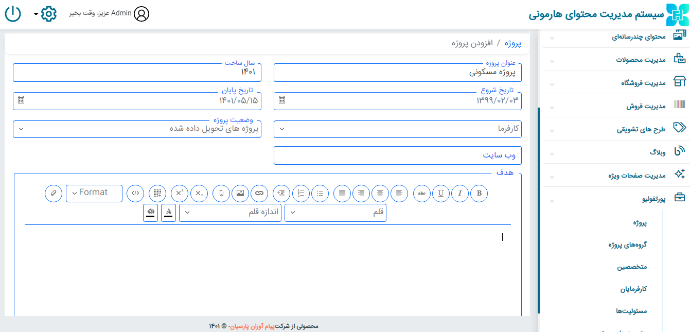 سپس اطلاعات مربوط به قسمت های عنوان پروژه، سال ساخت، تاریخ شروع و پایان، کارفرما، وضعیت پروژه و هدف و اقدامات را کامل کنید .