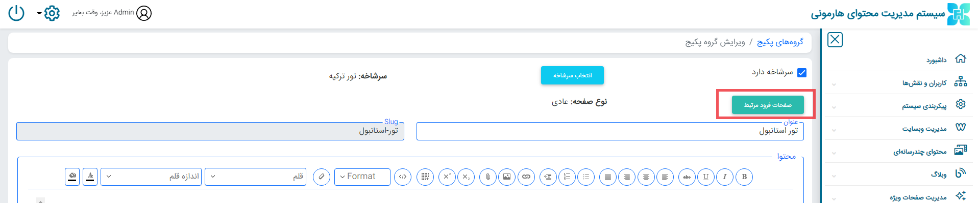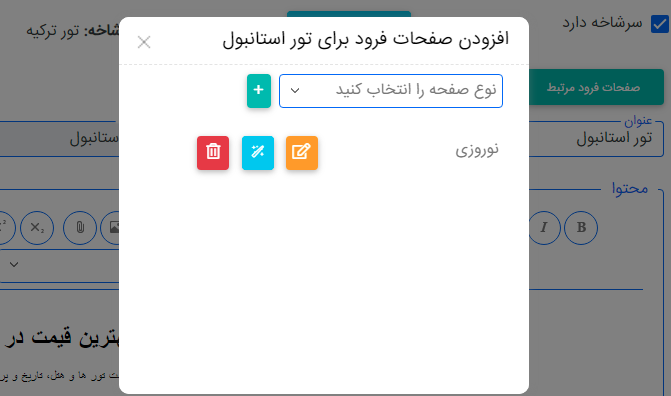 بسته به طراحی سایت شما، در صورتی که تور شما شامل تورهای نوروزی ( و یا تابستانه، لحظه آخری و ریلی ) می باشد ، می توانید در صفحه ی مدیریت گروه های پکیج با کلیک بر روی صفحات فرود مرتبط نوع صفحه را انتخاب کنید.