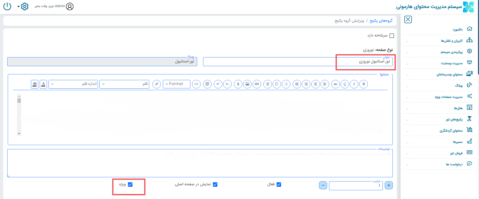 در این قسمت عنوان را ویرایش کرده و تیک ویژه را فعال و ذخیره نمایید.