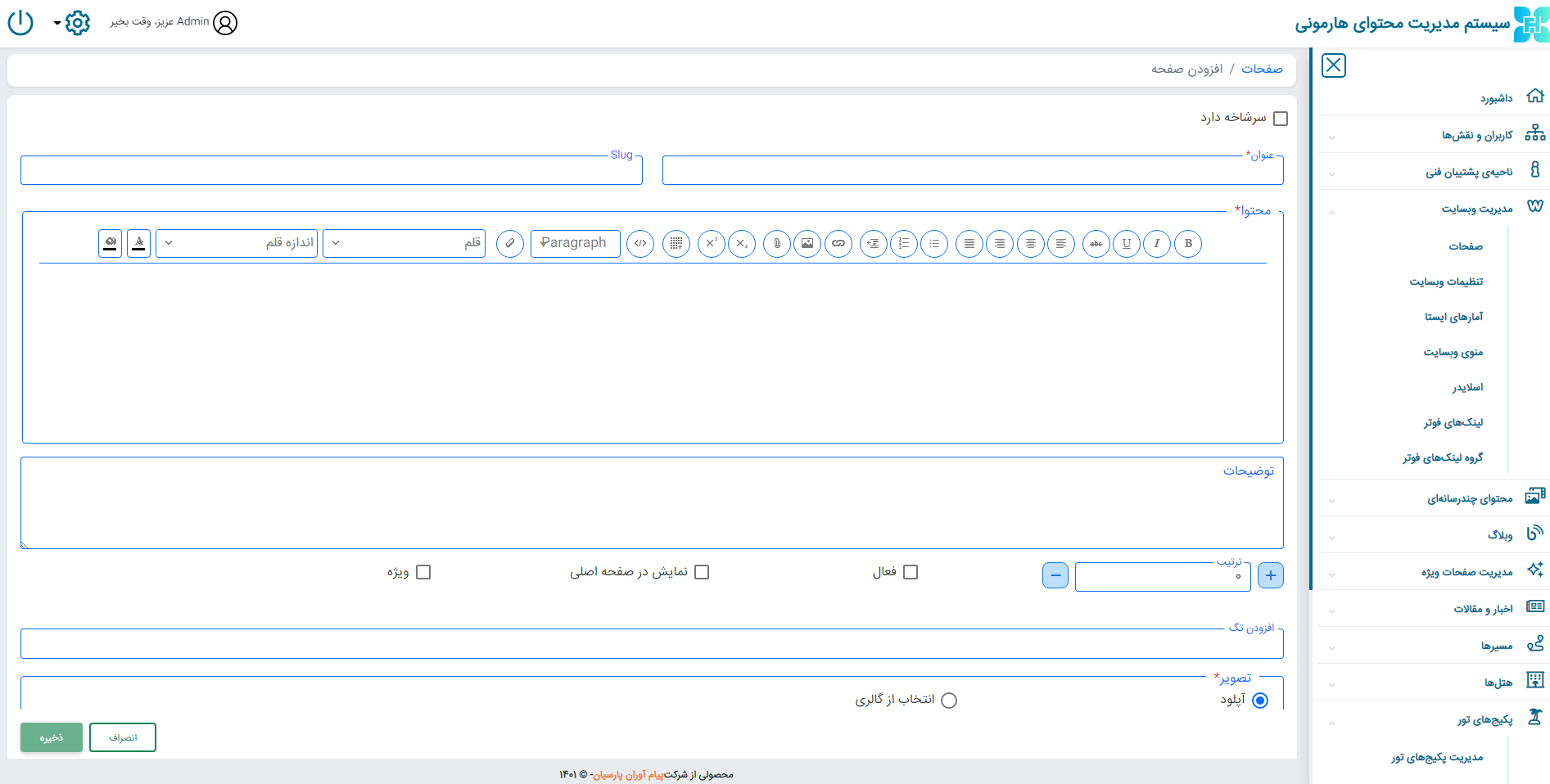 در این قسمت میتوانید هر محتوایی که نیاز دارید را به همراه تصویر بارگذاری نمایید و از آنها در قسمت های مختلف از جمله منو و فوتر وب سایت استفاده کنید.