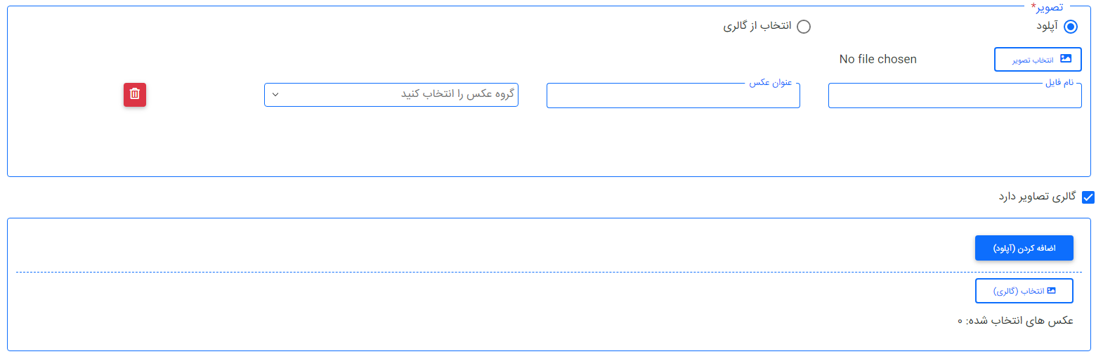 در فیلد اجباری بعدی تصویر آپلود کنید. همچنین اگر تصاویر بیشتری برای آپلود دارید میتوانید تیک گالری تصاویر را بزنید و تصاویرتان را آپلود کنید