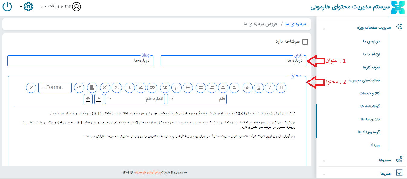 از قسمت مدیریت صفحات ویژه ← درباره ما ← روی افزودن درباره ی ما جدید کلیک کنید و عنوان و محتوا را وارد نمایید