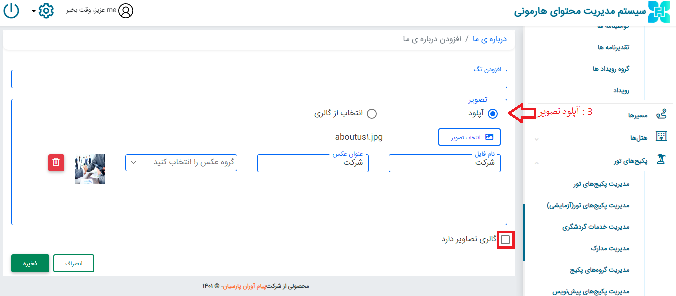 تصویر سایز شده مرتبط را آپلود کنید و نام فایل ، عنوان عکس و گروه عکس را مشخص کنید همچنین در صورت تمایل به آپلود چند تصویر روی گزینه ی گالری تصاویر دارد کلیک کنید.