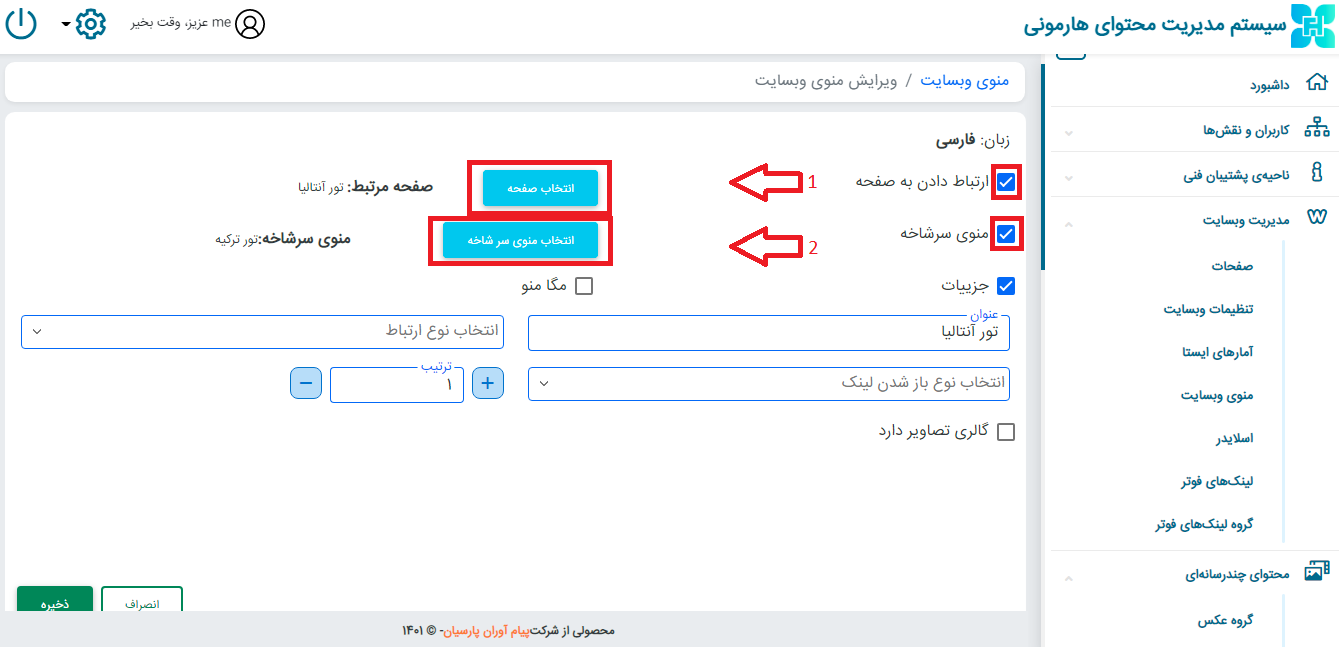 در ادامه اگر منوی که میخواهید ثبت کنید زیرشاخه است، کافی است در هنگام وارد کردن اطلاعات ← افزودن منوی جدید تیک منوی سرشاخه رو زده ← انتخاب منوی سرشاخه ← انتخاب سرشاخه از منو. مثلا تور آنتالیا زیر شاخه ی تور ترکیه است.