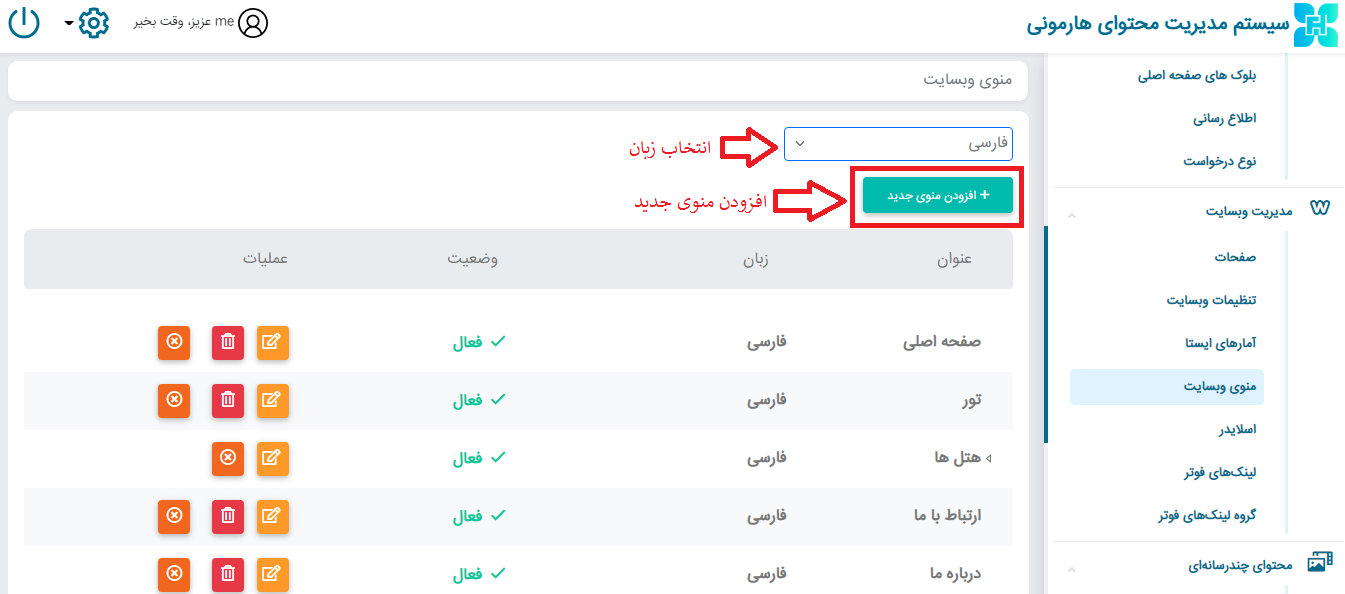 از قسمت مدیریت وب سایت ← منوی وبسایت ← زبان فارسی یا انگلیسی را انتخاب و سپس روی افزودن منوی جدید کلیک کنید.