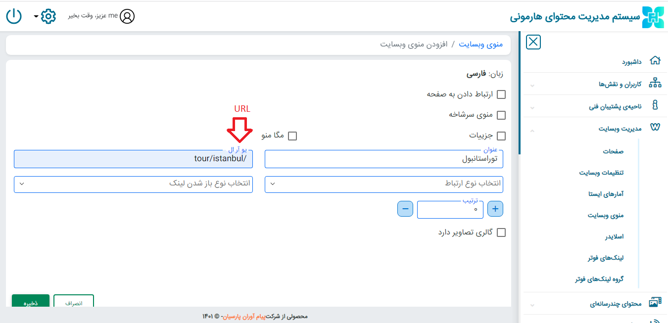 روش اول : در این روش برای ایجاد منو یو آر ال ( آدرس صفحه) را به صورت دستی در قسمت یو آر ال وارد و ذخیره کنید.