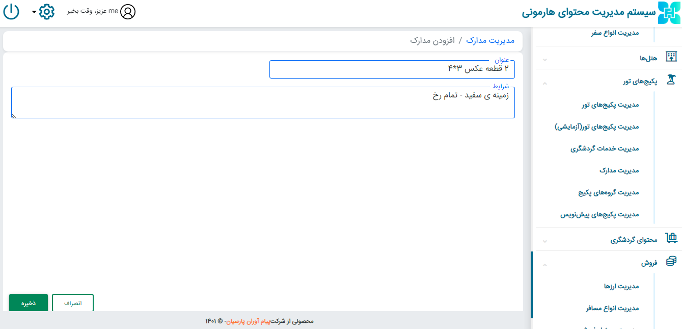 از قسمت پکیج تور ← مدیریت مدارک ← بر روی گزینهِ ی افزودن مدرک جدید کلیک کرده و بخش عنوان و شرایط را با اطلاعات موجود پر کنید؛ این کار را برای هر چند تا مدرک می توانید تکرار کنید.