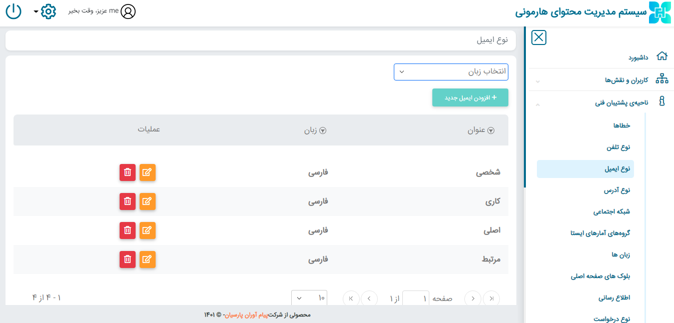 از قسمت ناحیه ی پشتیبانی فنی ← روی نوع ایمیل کلیک کنید ← انتخاب نوع زبان فارسی یا انگلیسی ← افزودن ایمیل جدید ← نوع ایمیل را در قسمت عنوان تایپ و ذخیره کنید.
