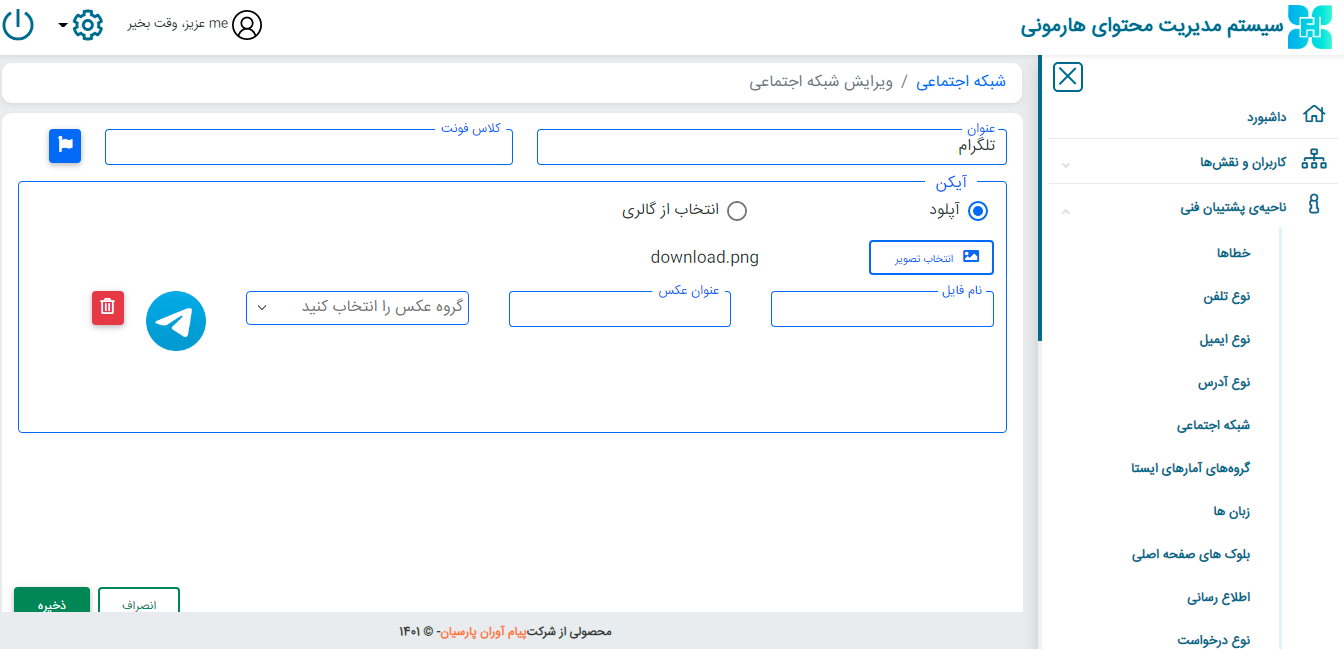 از قسمت ناحیه ی پشتیبانی فنی ← بر روی شبکه اجتماعی کلیک کنید ← افزودن شبکه اجتماعی جدید ← عنوان شبکه اجتماعی را وارد کرده و آیکن مرتبط را در فرمت SVG آپلود و ذخیره کنید.