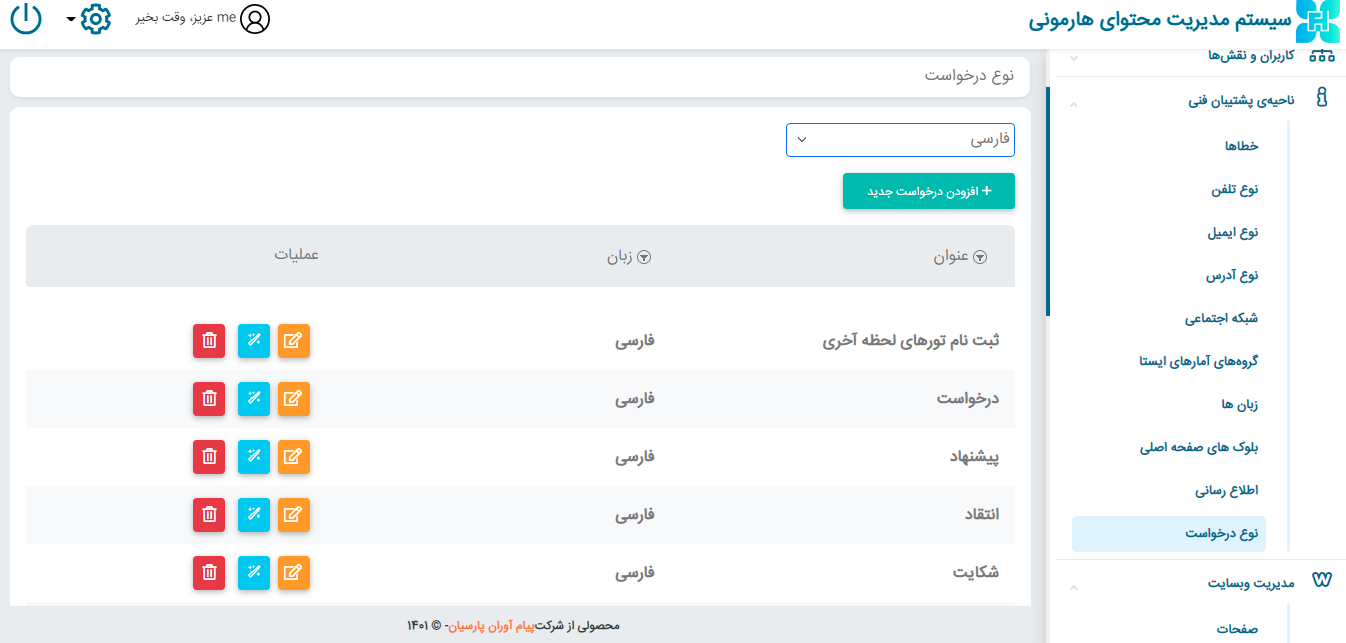 از قسمت ناحیه ی پشتیبانی فنی ← انتخاب زبان فارسی یا انگلیسی ← افزودن درخواست جدید ← عنوان درخواست را تایپ و ذخیره نموده.