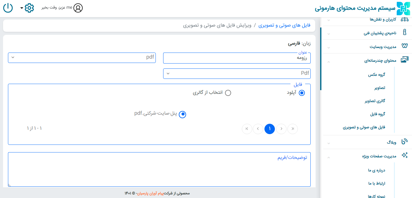 از قسمت محتوای چند رسانه ای ← فایل های صوتی و تصویری ← انتخاب زبان فارسی یا انگلیسی ← افزودن فایل صوتی و تصویری جدید ← عنوان مورد نظر را تایپ کنید سپس نوع فایل ( video , pdf , audio) و گروه فایل را انتخاب نموده و در قسمت فایل، فایل خود را بارگذاری کنید .