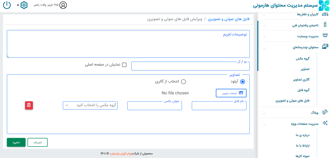 برای بارگذاری تصاویر یا ویدیو نیز در قسمت تصاویر فایل مورد نظر را با توجه به حجم و سایز بارگذاری میکنیم. نهایتا روی گزینه ی ذخیره کلیک و اطلاعات را ذخیره کنید.