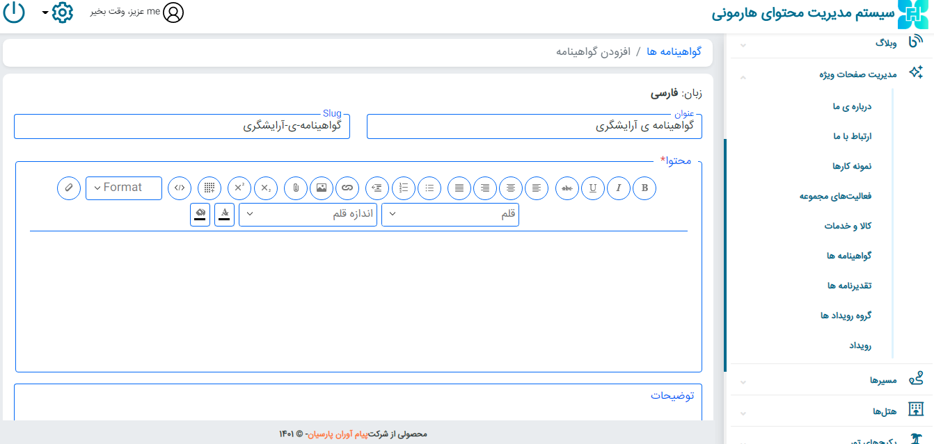 از قسمت مدیریت صفحات ویژه ← گواهینامه ها ← انتخاب زبان فارسی یا انگلیسی ← افزودن گواهینامه جدید ← عنوان و محتوا را وارد کنید.