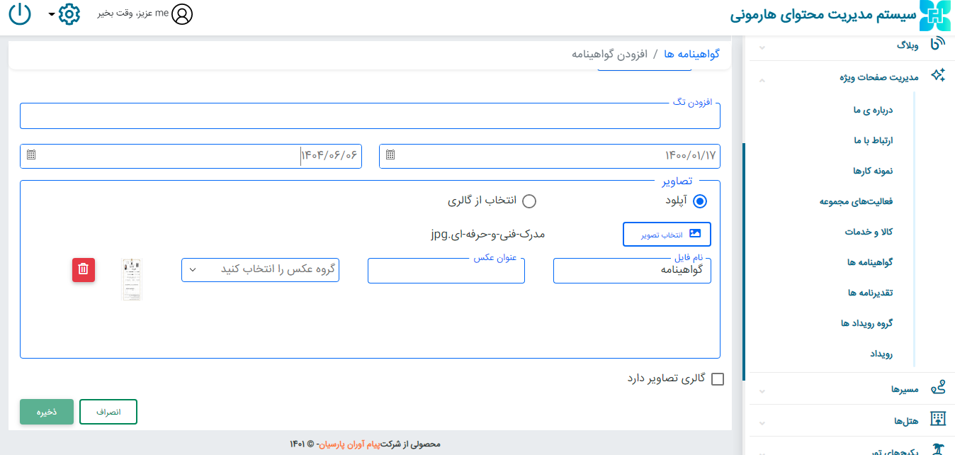 تاریخ صدور و انقضای گواهینامه را انتخاب کرده و عکس مرتبط را آپلود نمایید. همچنین در صورت تمایل به آپلود چند تصویر روی گزینه ی گالری تصاویر دارد کلیک کنید.