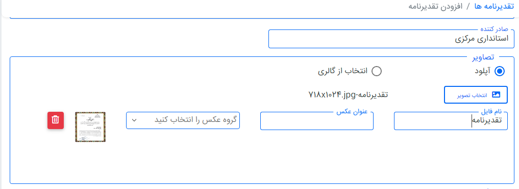 صادر کننده را مشخص کرده و تصویر تقدیرنامه را آپلود نمایید، همچنین در صورت تمایل به آپلود چند تصویر روی گزینه ی گالری تصاویر دارد کلیک کنید.