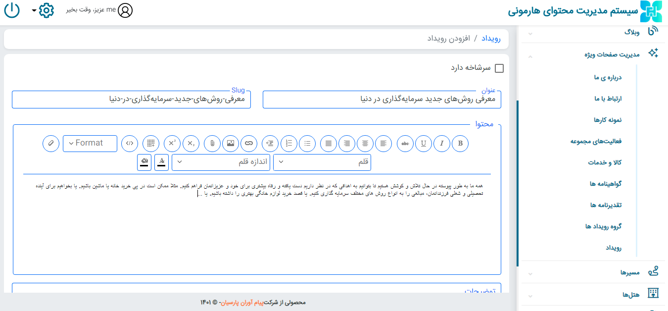 از قسمت مدیریت صفحات ویژه ← رویدادها ← افزودن رویداد جدید ← عنوان و محتوا را وارد کنید.