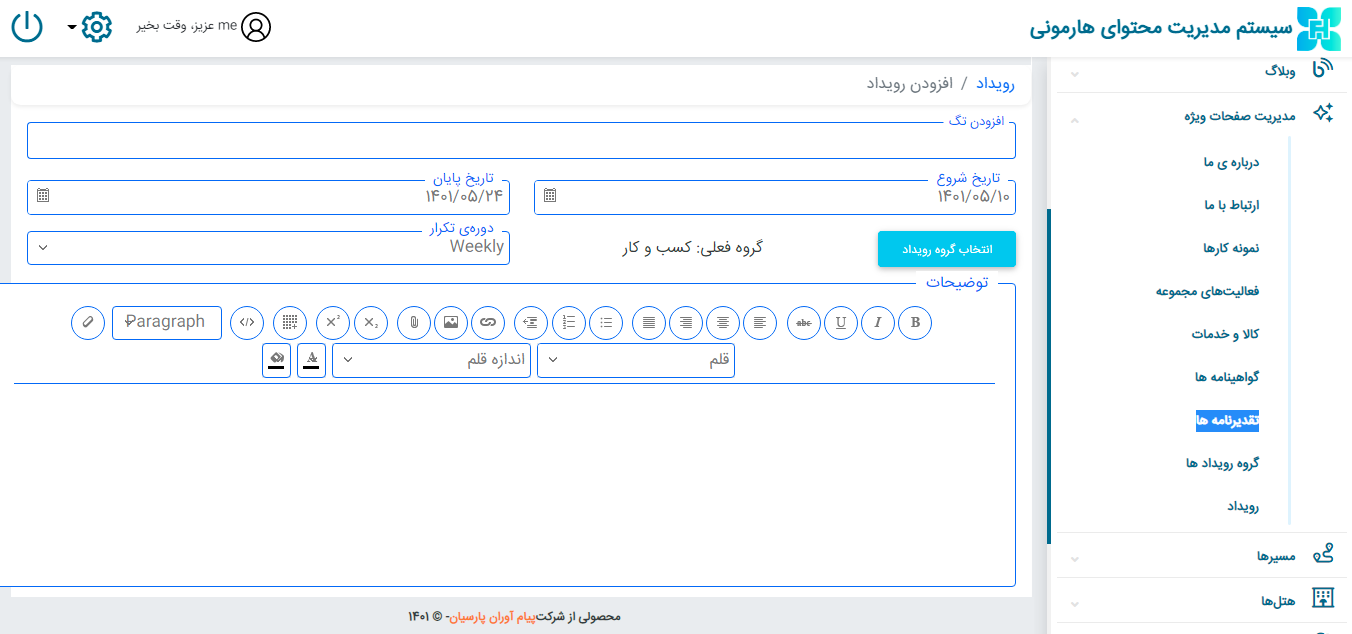 تاریخ شروع و پایان رویداد را وارد کنید؛ گروه رویداد و دوره ی تکرار : weekly هفتگی، monthly ماهانه، yearly سالانه را نیز مشخص نمایید.