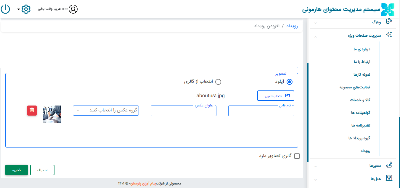 عکس مرتبط را آپلود نمایید. همچنین در صورت تمایل به آپلود چند تصویر روی گزینه ی گالری تصاویر دارد کلیک کنید.