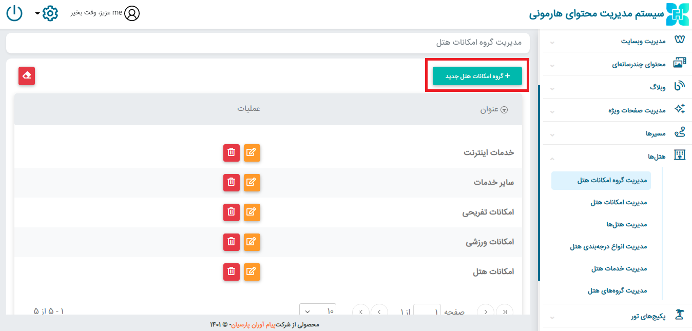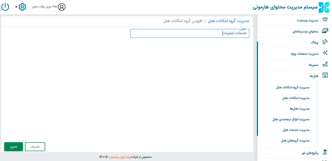 از قسمت هتل ها ← مدیریت گروه امکانات هتل ← گروه امکانات هتل جدید