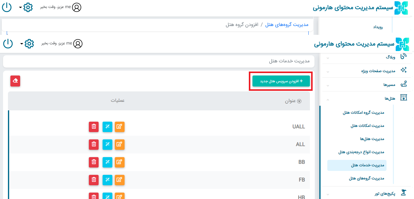 از قسمت هتل ها ←مدیریت خدمات هتل ← افزودن سرویس هتل جدید ← در قسمت عنوان نام سرویس را وارد و ذخیره نمایید.