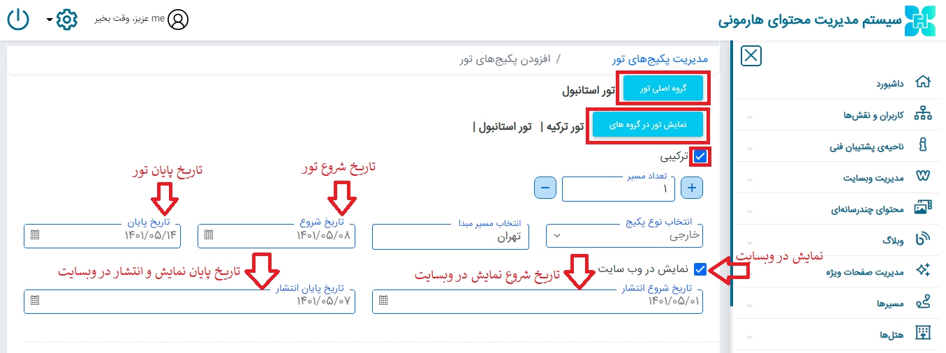 گزینه ی نمایش در وبسایت را زده تا تور شما در وب سایت نمایش داده شود و منظور از تاریخ شروع در این قسمت، تاریخ شروع نمایش پکیج تور در وبسایت و تاریخ پایان نمایش آن است.