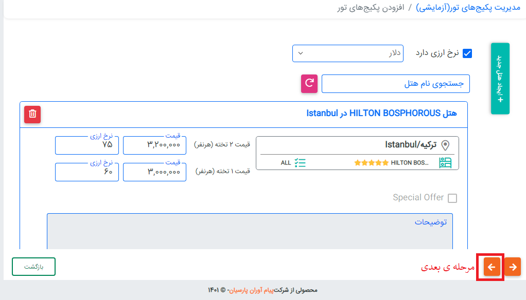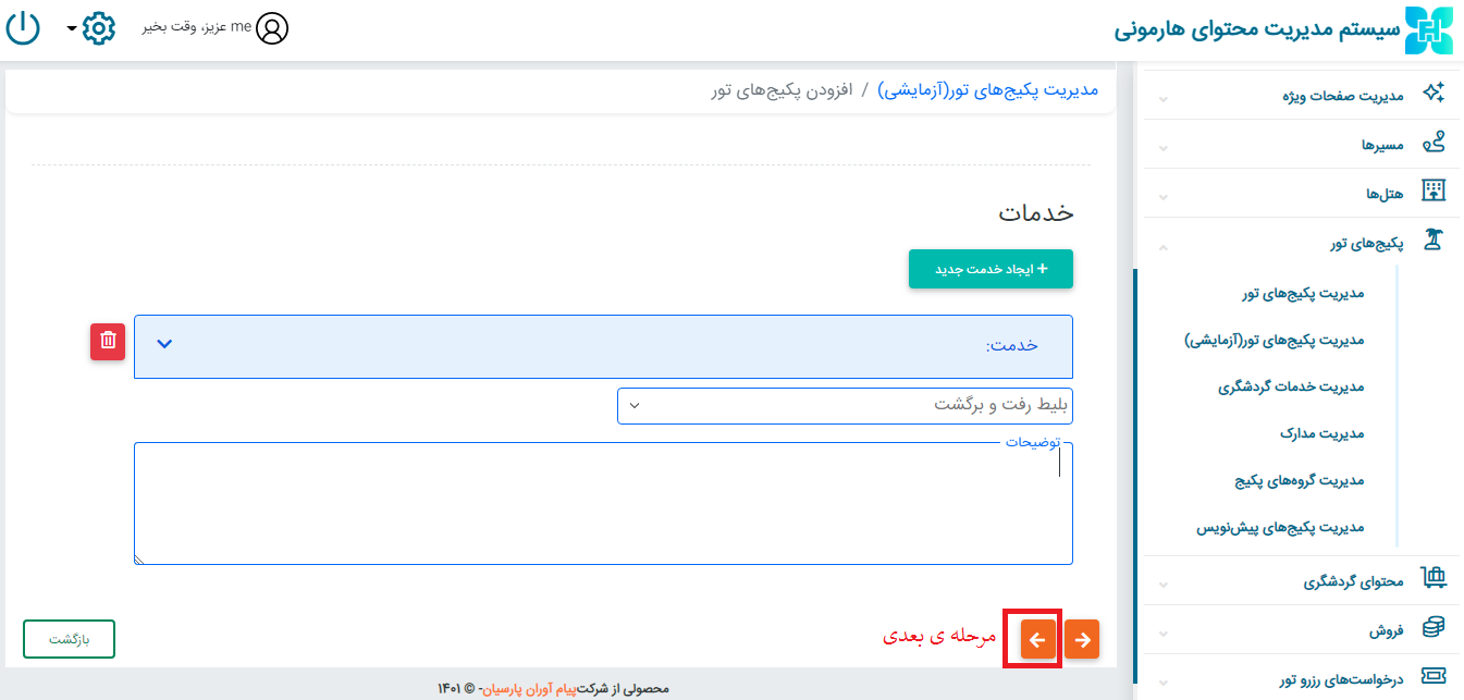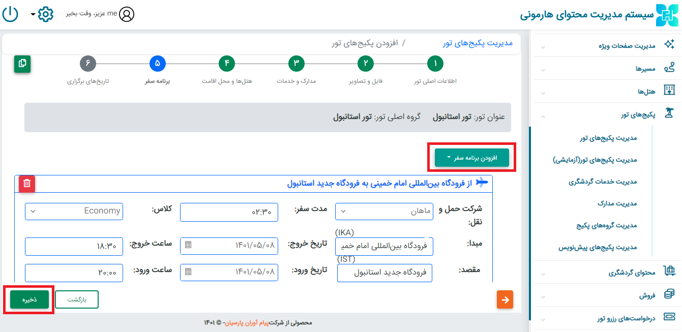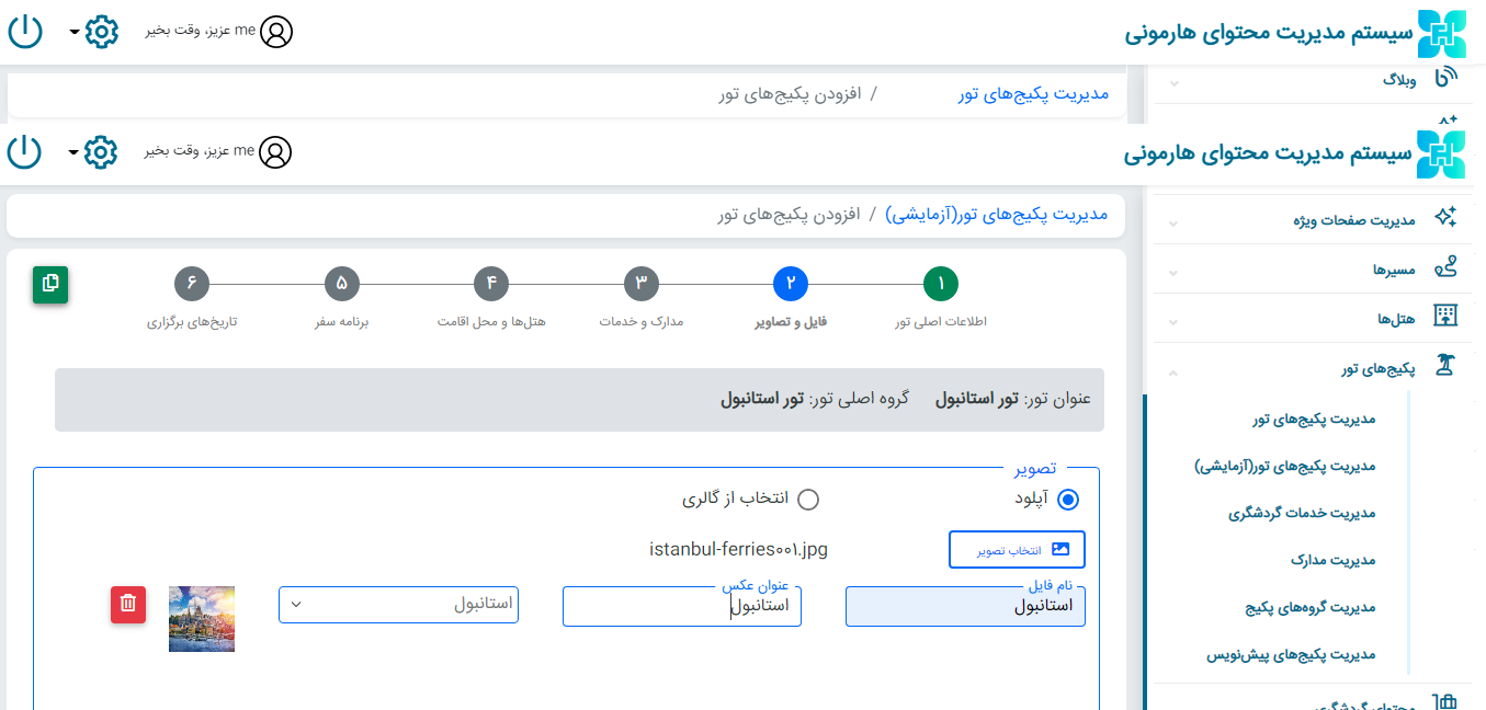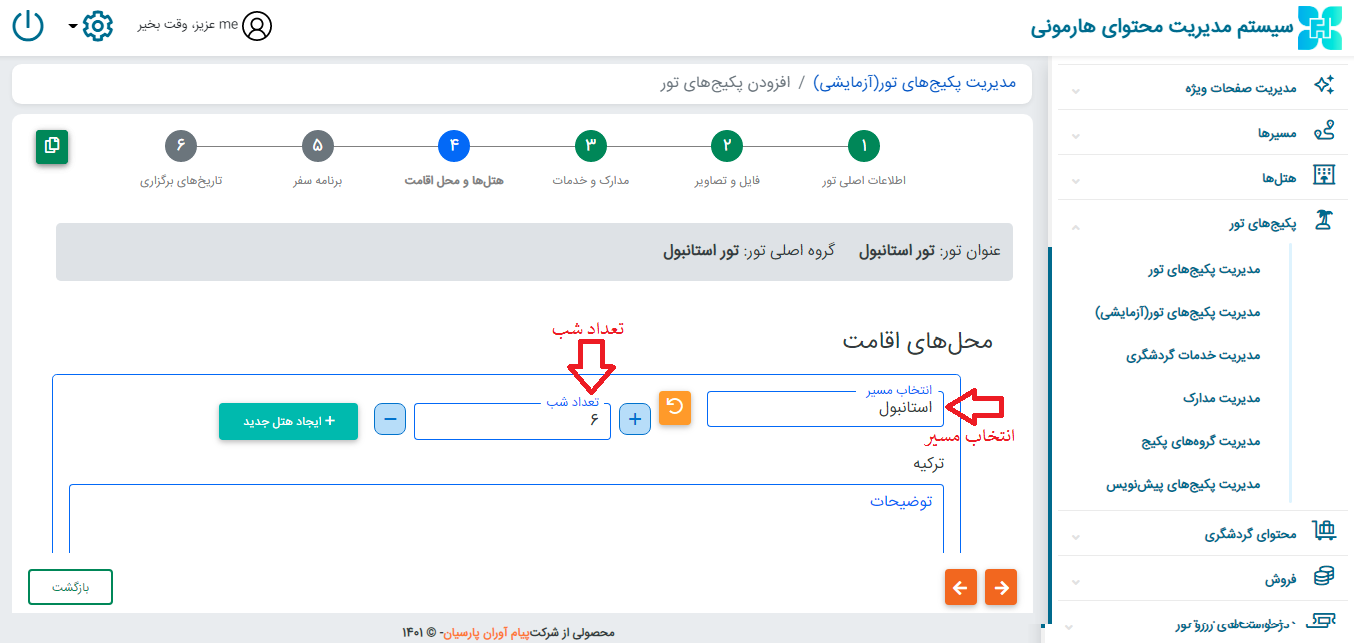 از قسمت پکیج تور ← مدیریت پکیج های تور ← افزودن پکیج تور جدید ← این بخش با 6 قسمت روبرو هستید :
