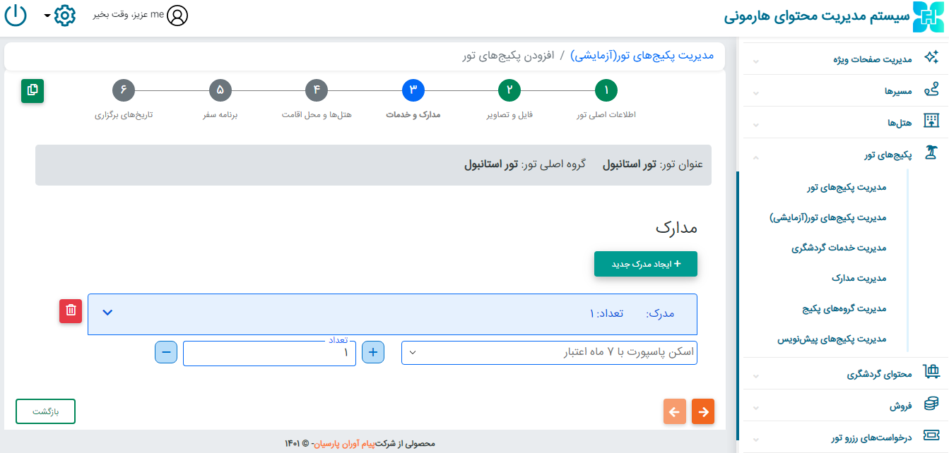 برای مشخص کردن مدارک موردنیاز ایین تور بر روی ایجاد مدرک جدید کلیک کرده ← انتخاب مدرک ← تعداد ← توضیحات ؛ این کار را برای هر چند تا مدرک می توانید تکرار کنید.