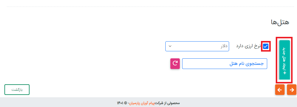 در بخش پایین تر به قسمت هتل ها رسیده و در صورت داشتن نرخ ارزی تیک را فعال کنید؛ سپس بر روی کادر مستطیل آبی رنگ کناری سمت راست (ایجاد هتل جدید ) کلیک کنید.