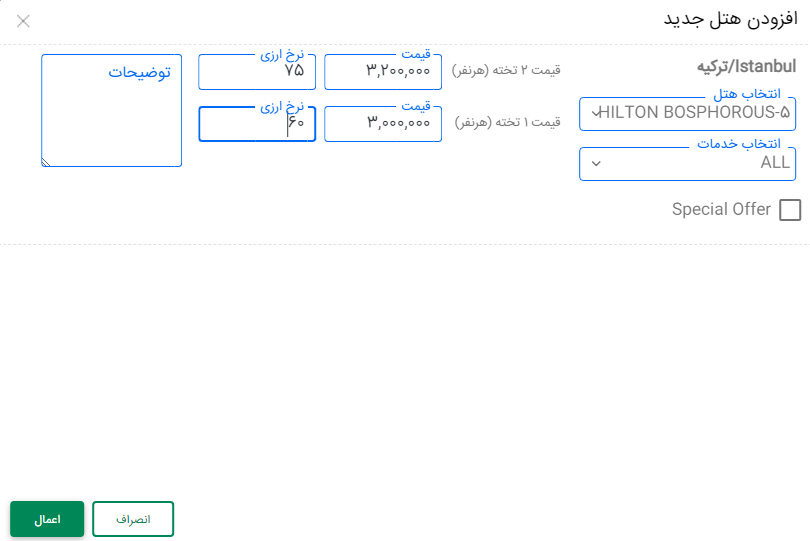 پس از کلیک بر روی ایجاد هتل جدید باید این اطلاعات صفحه را کامل کنید و رو گزینه ی اعمال کلیک کنید.