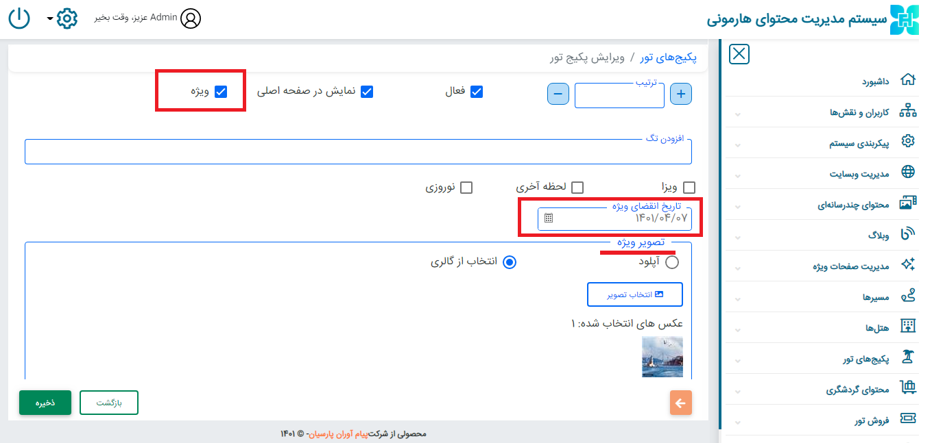 برای نمایش تور تیک فعال و نمایش در صفحه اصلی را بزنید. همچنین اگر تور شما ویژه باشد برای نمایش آن در صفحه ی اصلی : علاوه بر تیک فعال و نمایش در صفحه اصلی ، تیک ویژه را بزنید و تاریخ انقضای ویژه و تصویر ویژه را وارد نمایید.