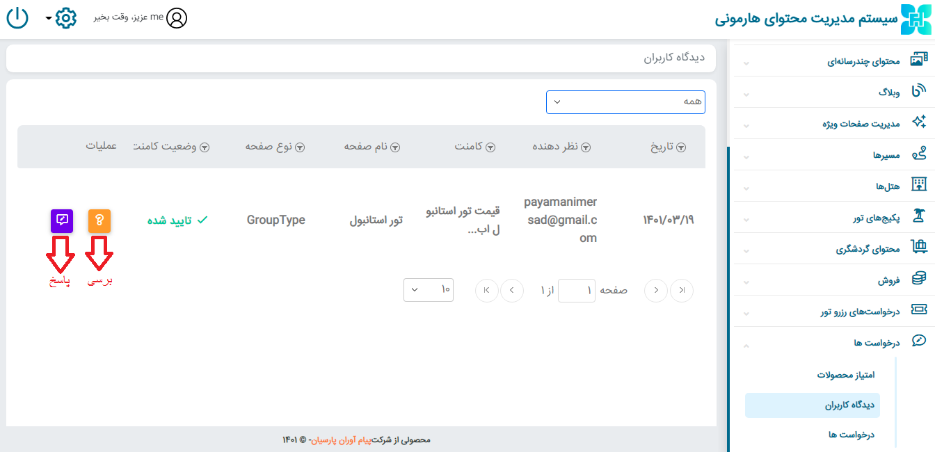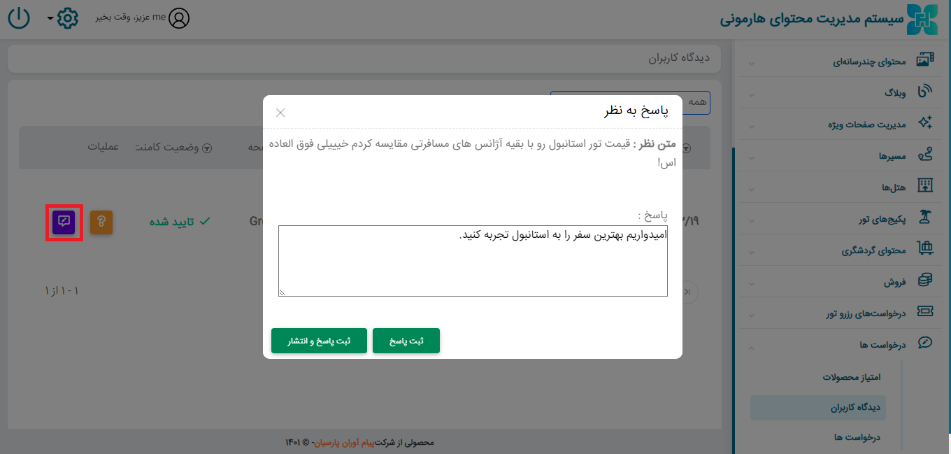 از قسمت درخواست ها ← دیدگاه کاربران ← در این بخش نظرات کاربران به مطالبی که در وبسایت خود به اشترک گذاشتند را می توانید مشاهده کنید؛ همچنین می توانید با کلیک روی مربع بنفش پاسخ کاربران را تایپ و ارسال کنید.