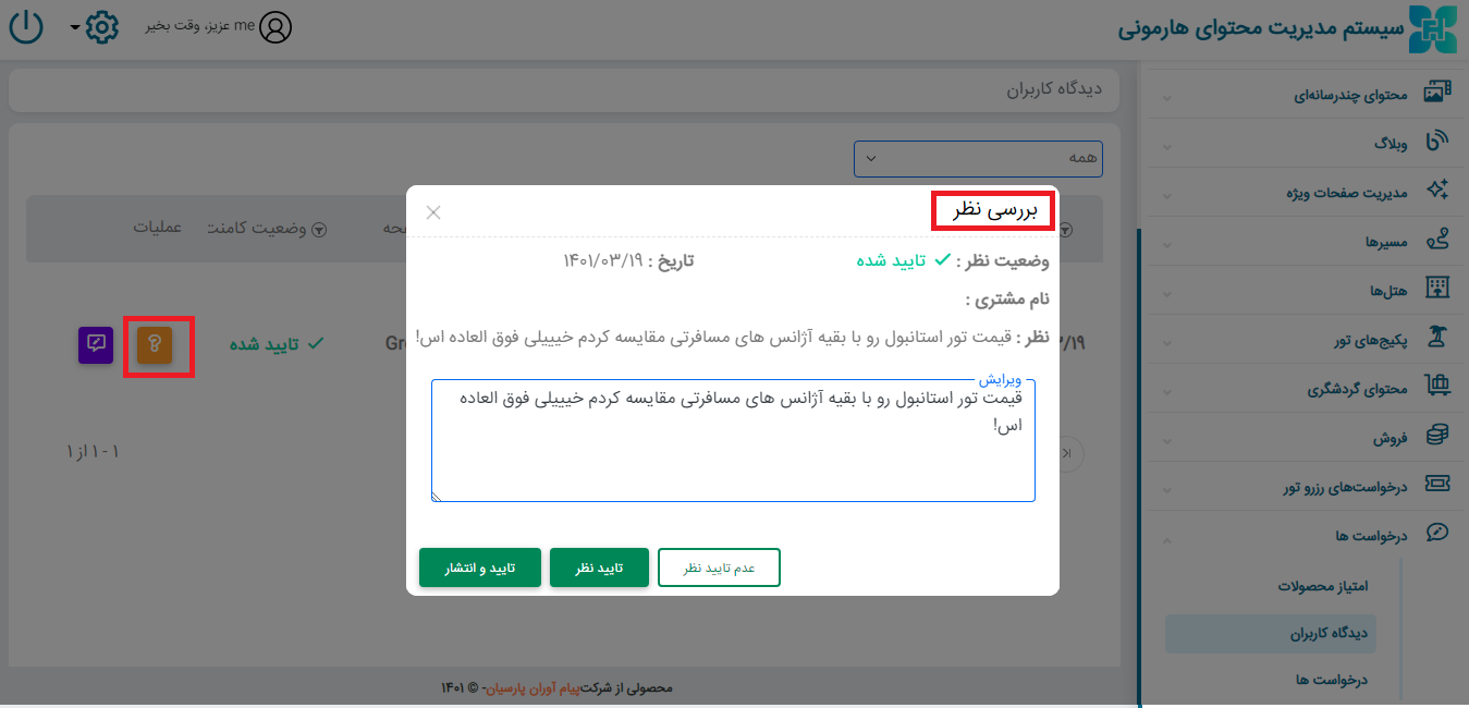 در این قسمت می توانید جزِیات نظر را مشاهده و ویرایش کرده؛ همچنین در نهایت نظر را تایید یا عدم تایید و منتشر کنید.