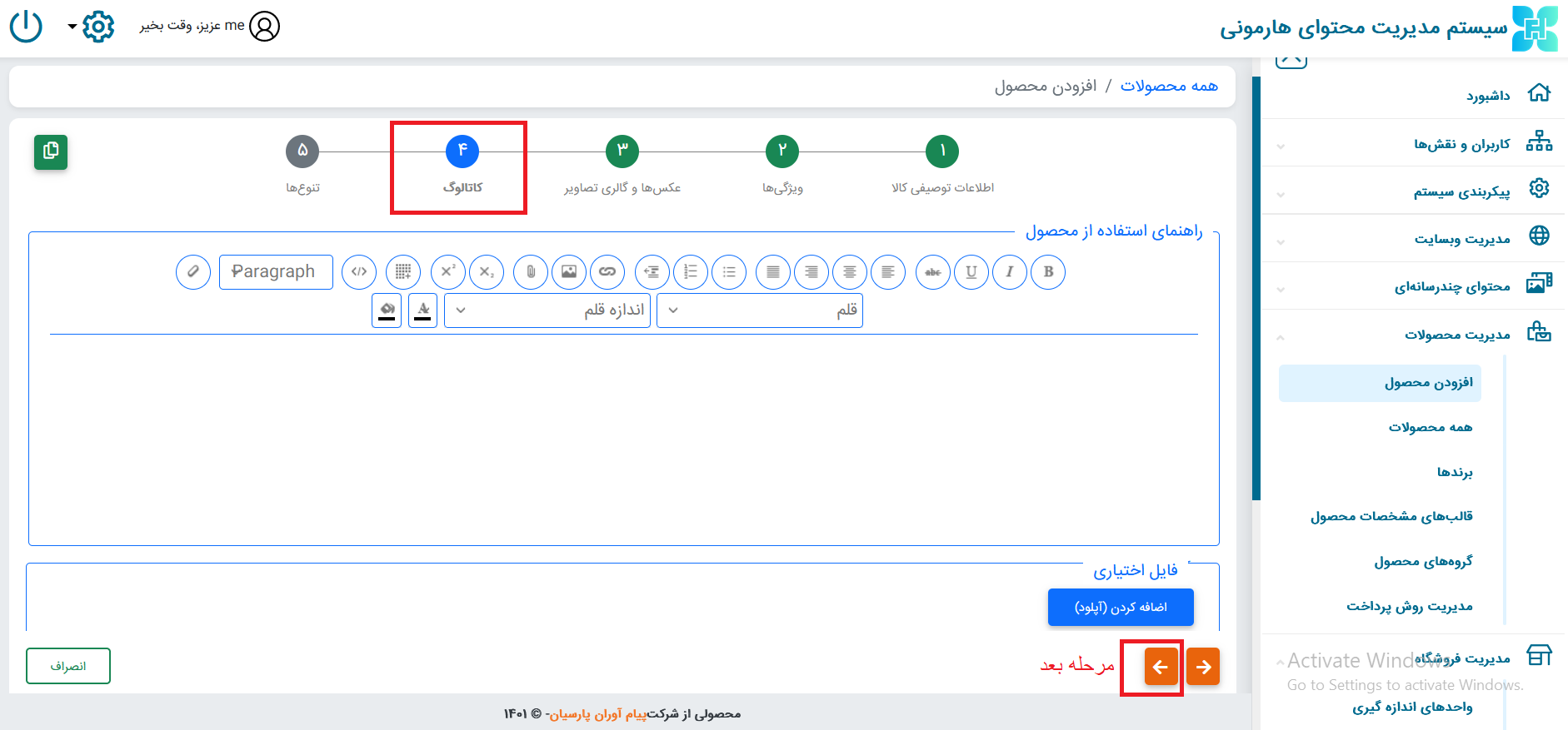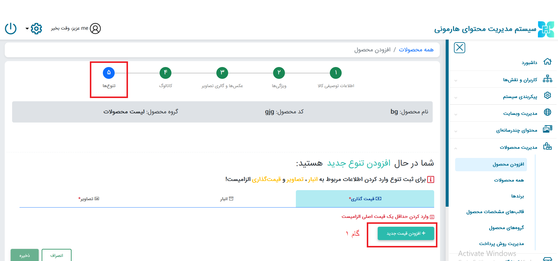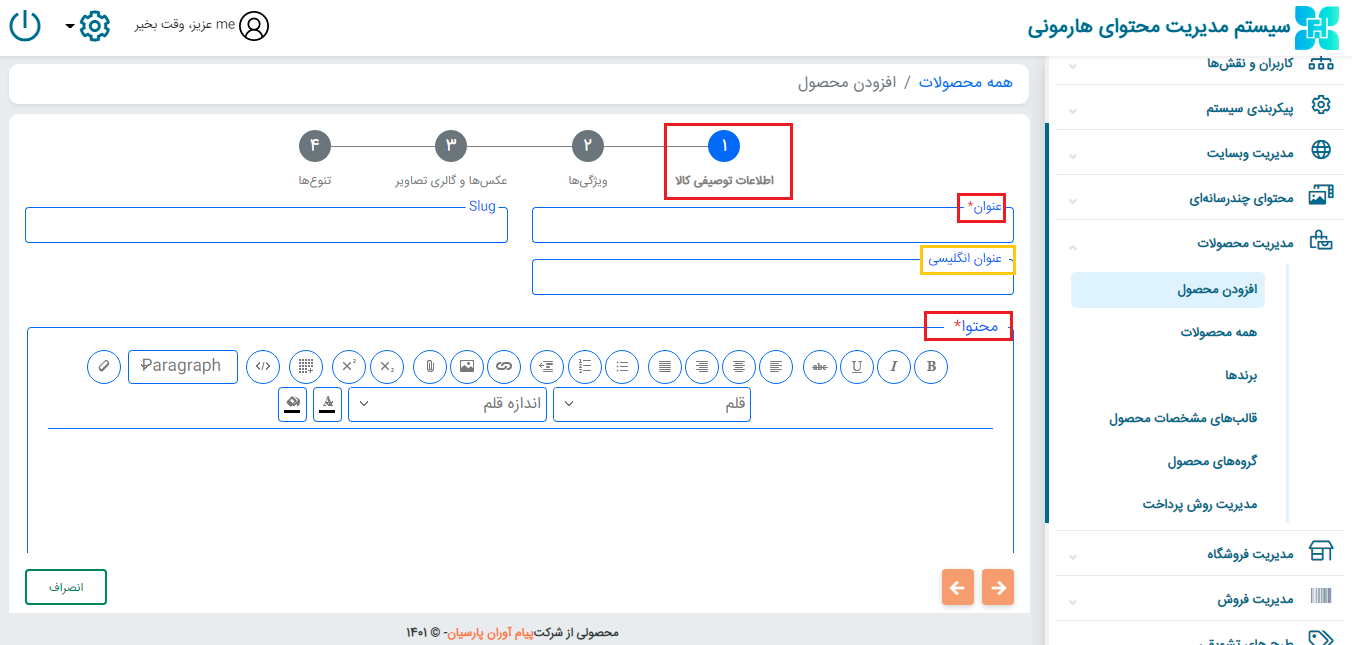 از قسمت مدیریت محصولات ← افزودن محصول ← این بخش با 4 قسمت روبرو هستید: