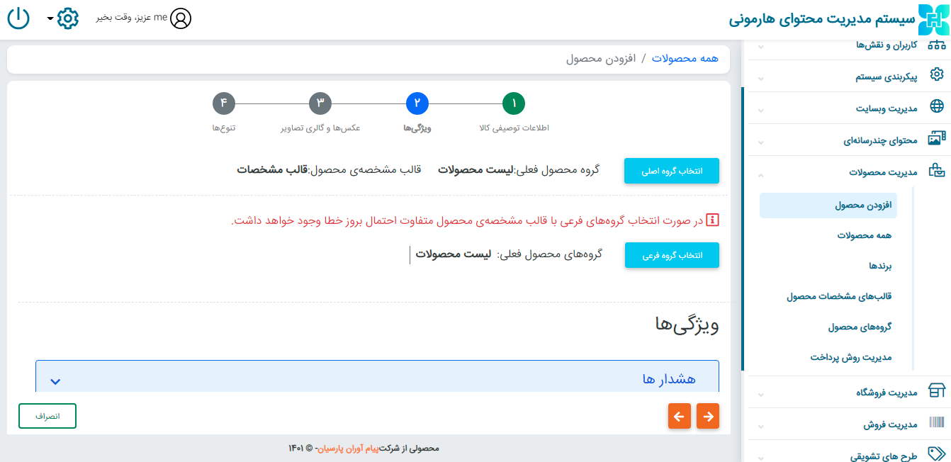 نکته: برای انتخاب گروه اصلی و فرعی ابتدا باید در بخش گروه محصولات ، گروه ها را تعریف کنید.