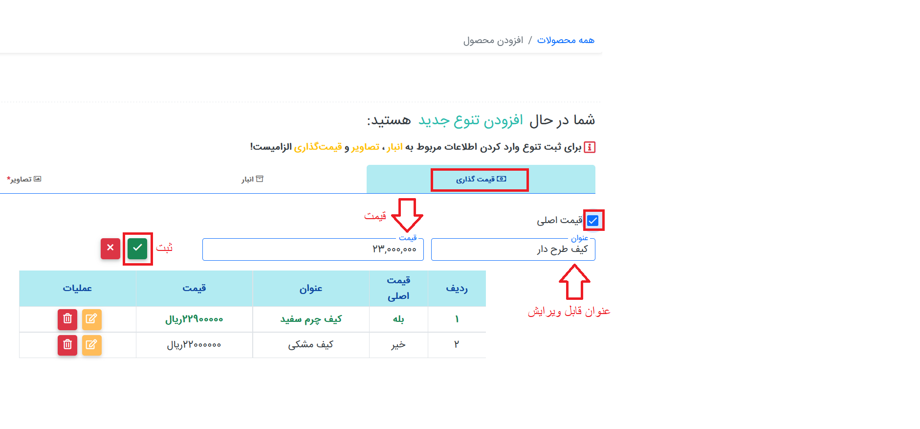 سپس با صفحه ی زیر مواجه می شوید. در بخش عنوان نام کالا را وارد نموده و قیمت را نیز وارد نمایید، همچنین می توانید بسته به ویژگی های محصول چندین قیمت برای یک محصول تعریف کنید.