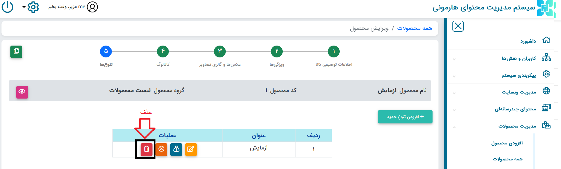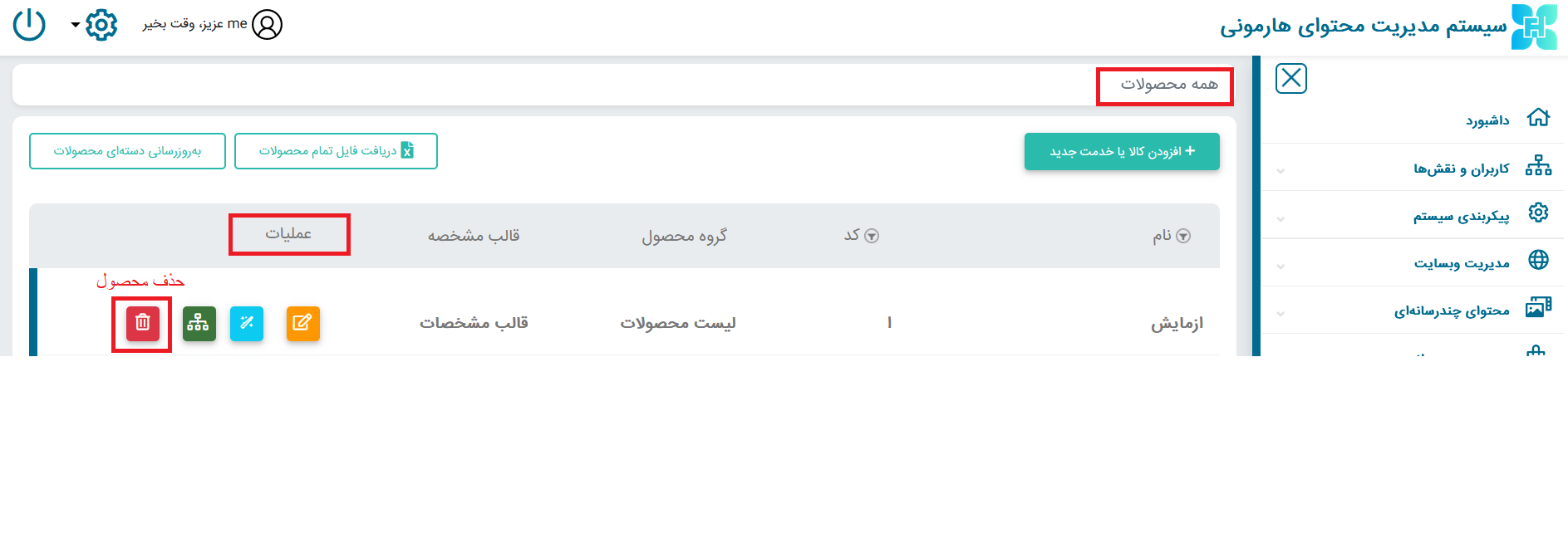 اکنون درصفحه ی همه محصولات و در قسمت عملیات گزینه ی حذف قابل مشاهده و در دسترس می باشد. با کلیک روی گزینه ی حذف، محصول را حذف نمایید.