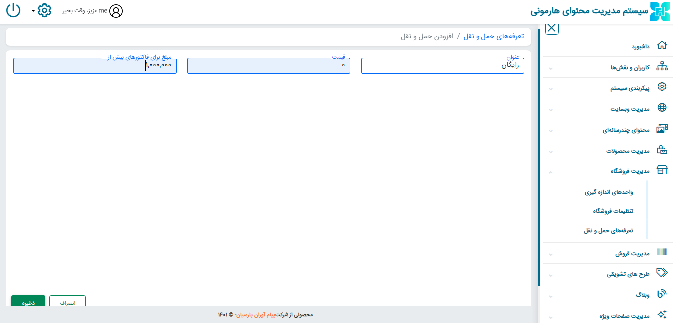 از قسمت مدیریت فروشگاه ← تعرفه های حمل و نقل ← عنوان، قیمت و مبلغ برای فاکتور های بیش از را مشخص و ذخیره کنید.