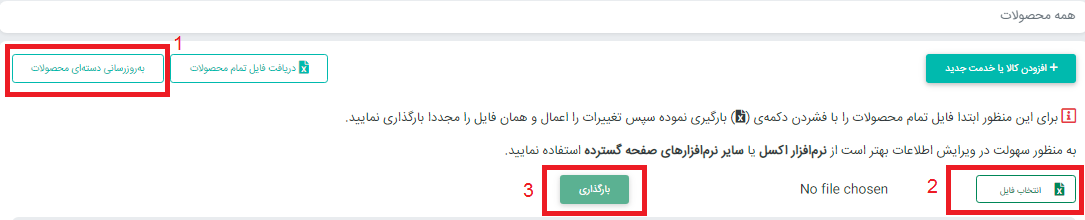 برای این منظور ابتدا فایل اکسل همه محصولات را دریافت کنید؛ سپس فایل دریافتی را ویرایش و ذخیره نمایید.