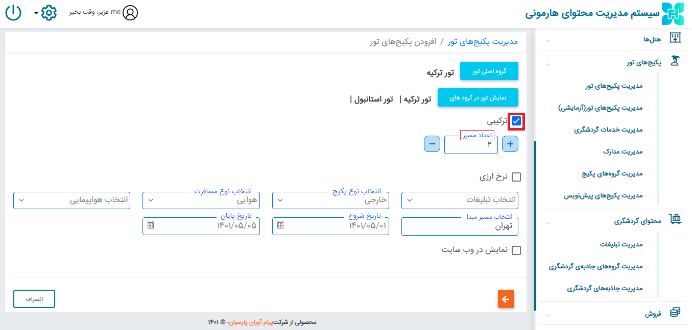 بقیه مراحل را مانند آموزش مدیریت پکیج تور اجرا و اطلاعات را ذخیره کنید.