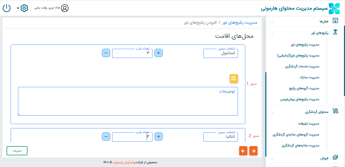 سپس در بخش هتل ها و محل اقامت به تعداد مسیر ها باید محل اقامت تعریف نمایید.